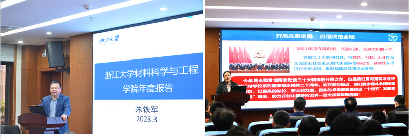 首先,朱铁军院长全面总结了2022年学院工作成果,并分析了现存问题,明确了2023年学院工作要点和重要专项任务。他提到,2022年材料学科入选新一轮“双一流”建设学科名单,学科平台、科研经费和科技奖励等方面取得佳绩,教育教学水平不断提升,国际合作与交流攻坚克难持续推进,师资队伍不断优化。学科持续推进电镜服务、科普教育,多位教师担任期刊主编,服务学术共同体,科创成果服务国家、地方和企业。同时,他分析了学院在高层次人才、教学成果、重大科研项目、国家级平台,以及发展空间等方面的现存问题。2023年,学院将深入学习贯彻党的二十大精神,加快建设高质量教育体系和国际一流前列的人才队伍,加快一流前列材料学科建设,拔尖筑峰,打造国家战略科技力量,加快治理能力现代化建设,以高质量党建引领高质量世界一流前列材料学科建设。2023年,材料学院成立45周年,学院将以此为契机总结展望,加强文化传承和校友联络。
