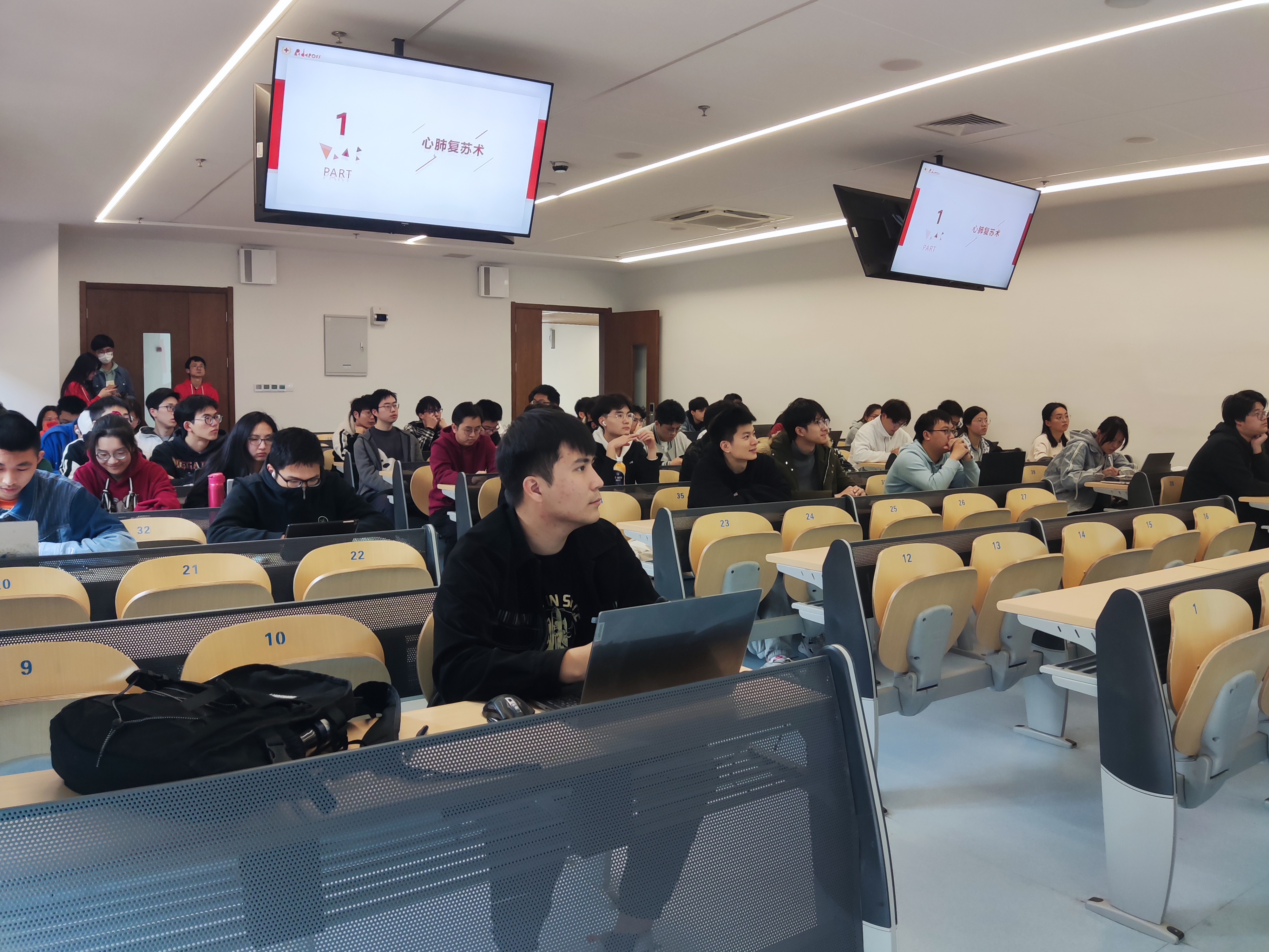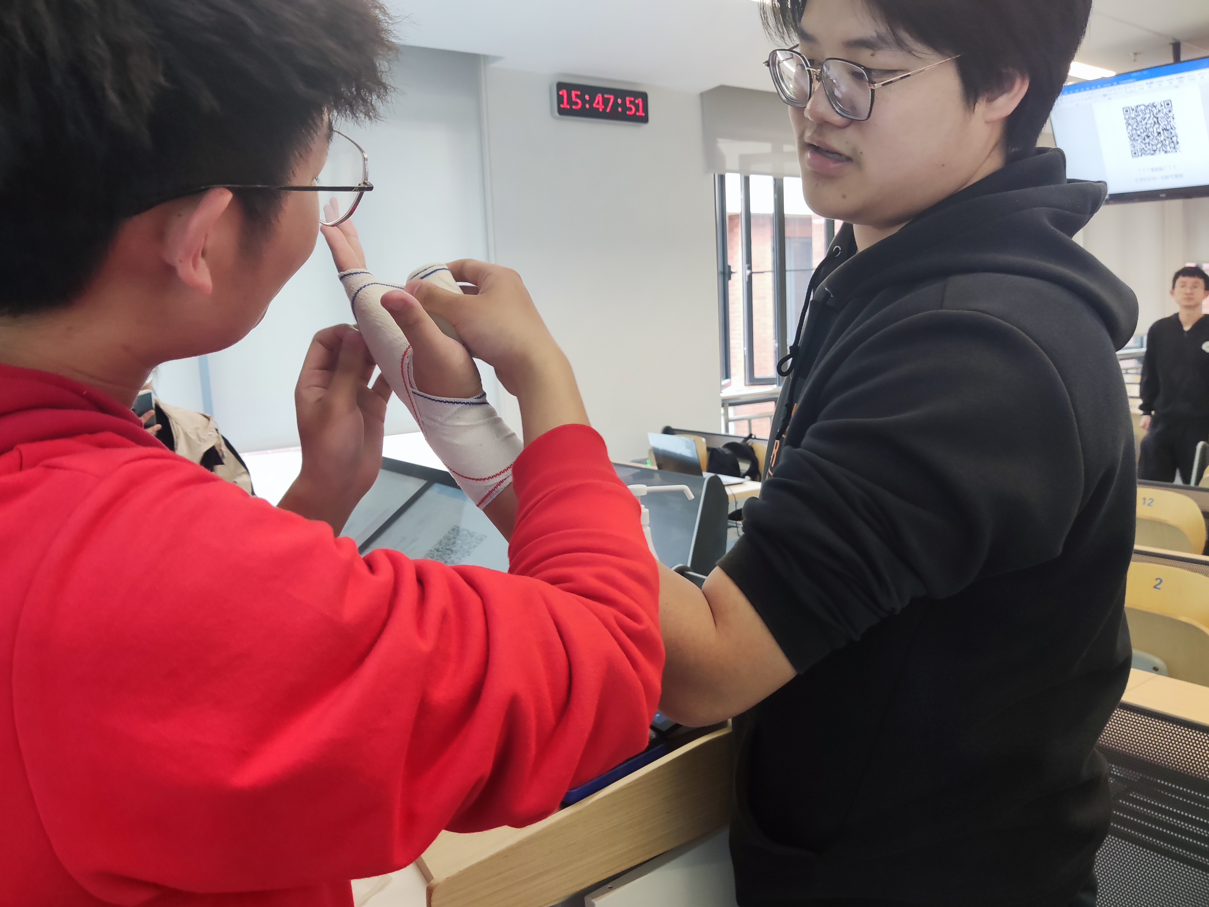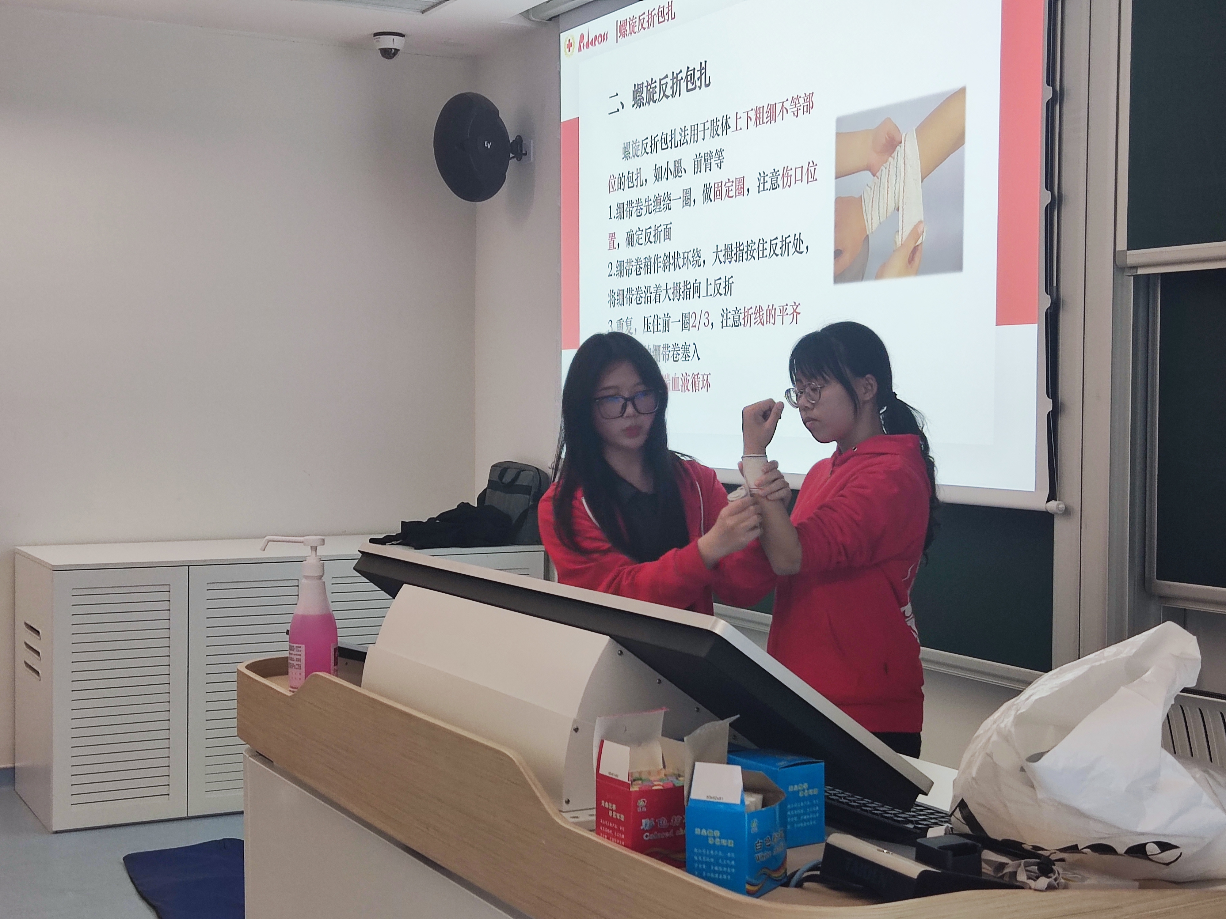 现场的同学认真聆听讲座,并在讲座结束后积极参与了实操。在红会同学们的指导下,参与实操的同学完成了胸外按压、伤口包扎等操作。