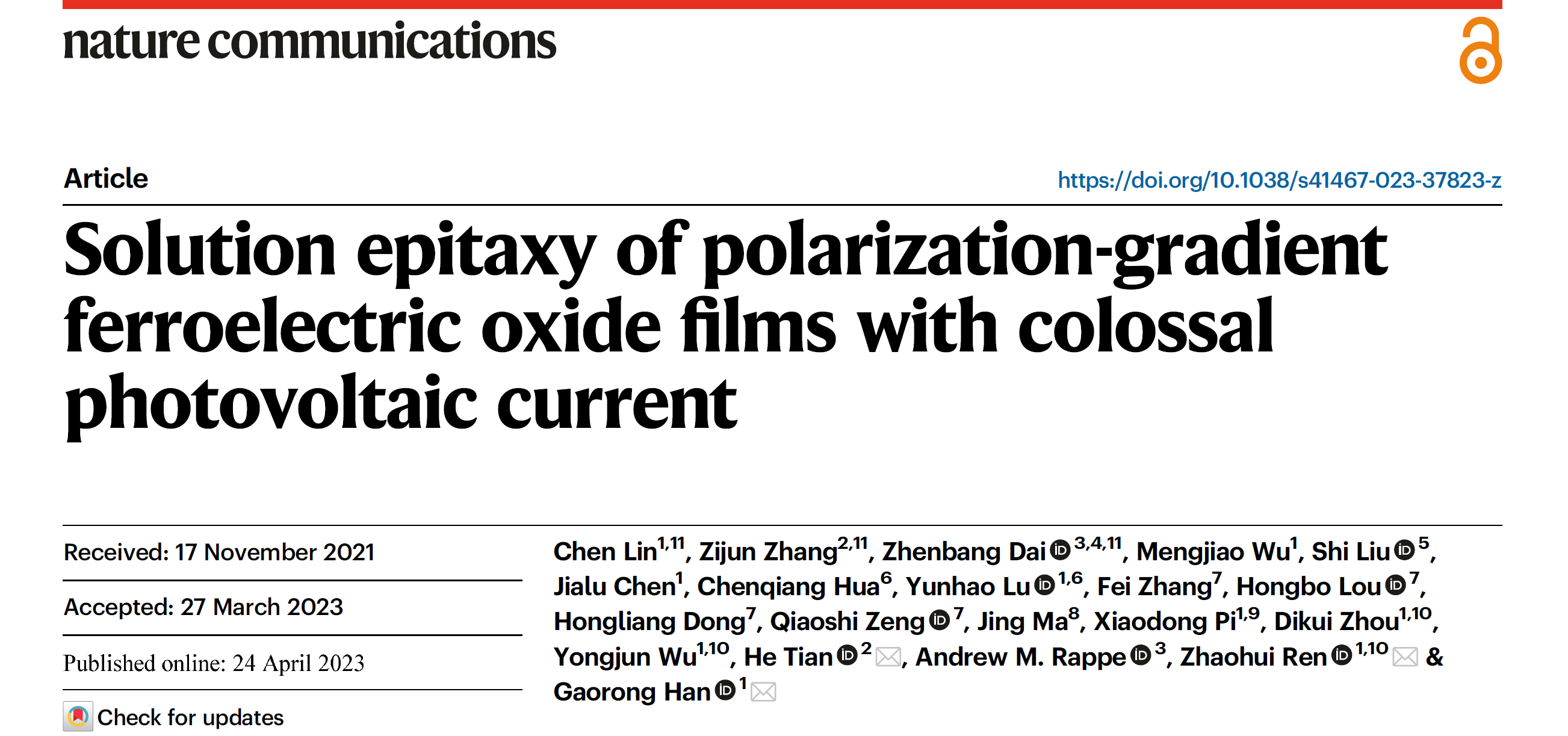 近日,浙江大学材料学院韩高荣教授、任召辉副教授课题组联合田鹤教授课题组,在铁电氧化物单晶薄膜的溶液外延策略、生长机制与光电性能调控方向取得重要进展,相关工作以“Solution epitaxy of polarization-gradient ferroelectric oxide films with colossal photovoltaic current”为题发表在2023424日出版的《Nature Communications》上。