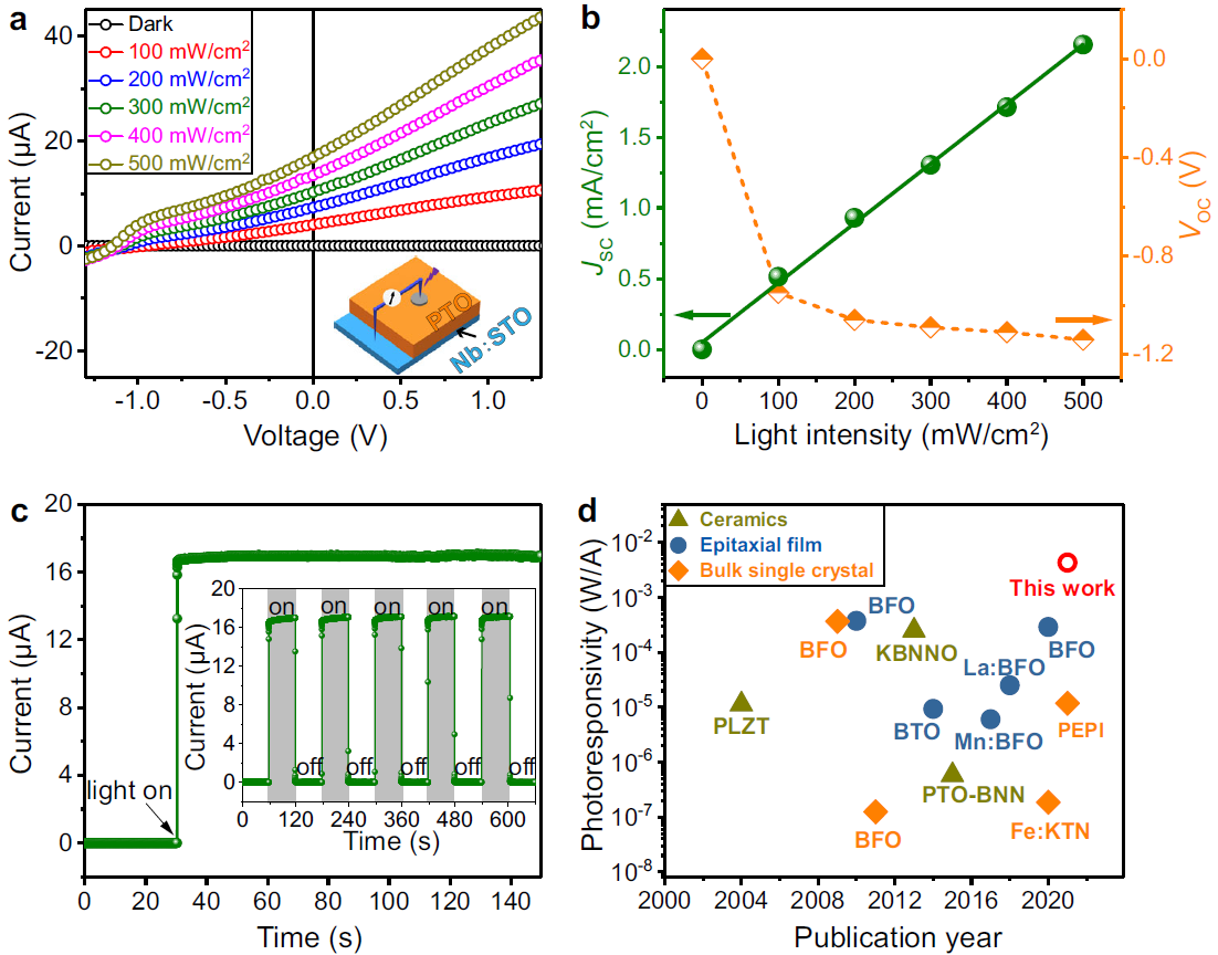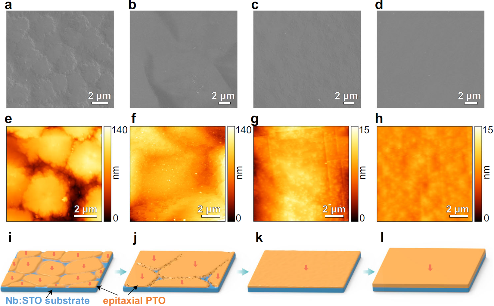 在这项工作中,研究团队发现,与传统气相外延的机制不同,界面晶格失配度并非低温外延生长的热力学主导因素;揭示了薄膜-衬底间的电子极化屏蔽在调控界面能和外延生长模式中的关键作用,提出了极化屏蔽驱动的铁电氧化物薄膜低温(100 oC-200oC)溶液外延新策略,解决了系列晶格失配度铁电氧化物低温外延的难题;获得PbTiO3Pb(Zr,Ti)O3BiFeO3等单畴、梯度结构铁电氧化物薄膜材料,并在这类梯度结构薄膜中发现了巨大的、可被极化方向调制的体光伏电流,其光响应度为目前铁电氧化物材料的最优值。