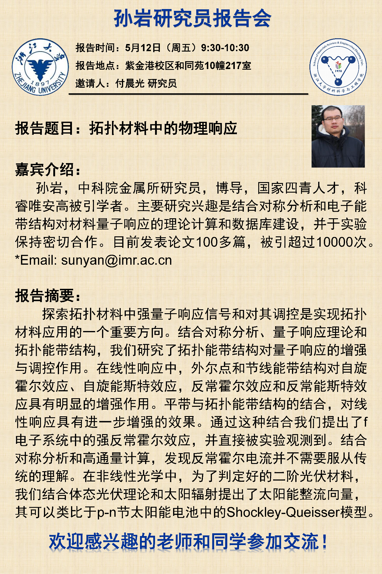 学术报告202306-拓扑材料中的物理响应--中科院金属所孙岩研究员报告会