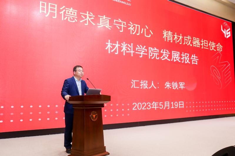 朱铁军院长向大会汇报学院发展情况和未来愿景。朱铁军院长总结了建院(系)45年来的发展情况,在人才培养、科学研究、队伍建设、社会服务、党建与文化建设等方面取得了突出成绩,提出三步走战略,希望在2030年跨入世界一流学科前列。朱铁军院长向多年来关心支持学院(系)发展的历任领导、兄弟院校、社会各界、广大校友和全院师生致以衷心感谢。他表示,学院将在保持原有优良传统基础上拓展新思维、新理念、新做法,认真谋划,扎实推进,力争推动材料学院事业发展迈上新台阶。