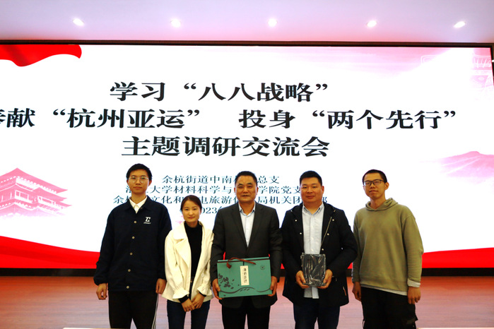 浙大材料学子移步文化礼堂会议大厅,同中南村党总支开展了学习“八八战略”,奉献“杭州亚运”,投身“两个先行”主题调研成果交流会。
