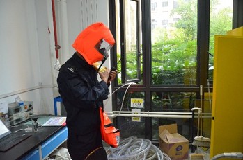 与此同时应急处置小组的两名成员,已在安全技术专家梅工的指导下穿戴好呼吸器具,佩戴好气体监测设备,手持灭火器,在警戒入口处做好信息登记后进入现场进行应急处置。进入后,一名队员排查泄露源迅速关闭气体阀门。另一名队员将门窗打开,确认安全情况后启动了实验室的应急排风。