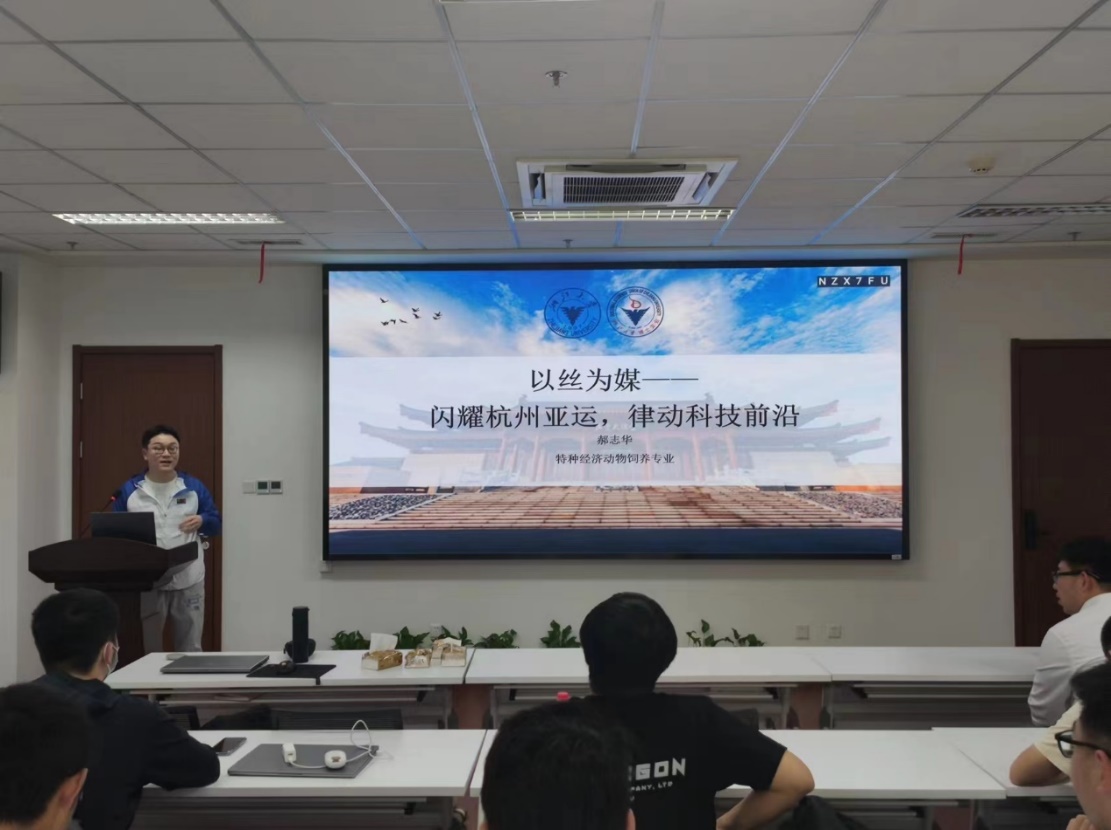 浙江大学博士生报告团讲师、动物科学学院特种经济动物饲养专业2019级博士生郝志华以《以丝为媒——闪耀杭州亚运,律动科技前沿》的宣讲。郝志华以丝绸为媒介,带领大家一同走进杭州亚运会中蚕丝交织的光辉,结合个人研究方向介绍丝绸古今发展,启迪台下青年一辈的党员同志们主动担当,扛起产业兴旺、乡村振兴、科技发展的责任,与中华文化一同璀璨。