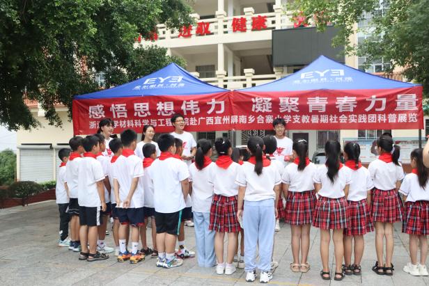 实践团在浙江大学西迁宜山纪念广场围绕浙大西迁精神、习近平总书记对于广西发展的重要讲话精神以及实践团十年的支教成果风采开展科普展览活动,并面向宜州区中心小学的二十余名学生宣讲浙江大学的校史文化。实践团成员通过知识讲解、互动问答等形式,向小朋友们介绍浙江大学西迁宜山的历史故事,教唱浙江大学校歌。