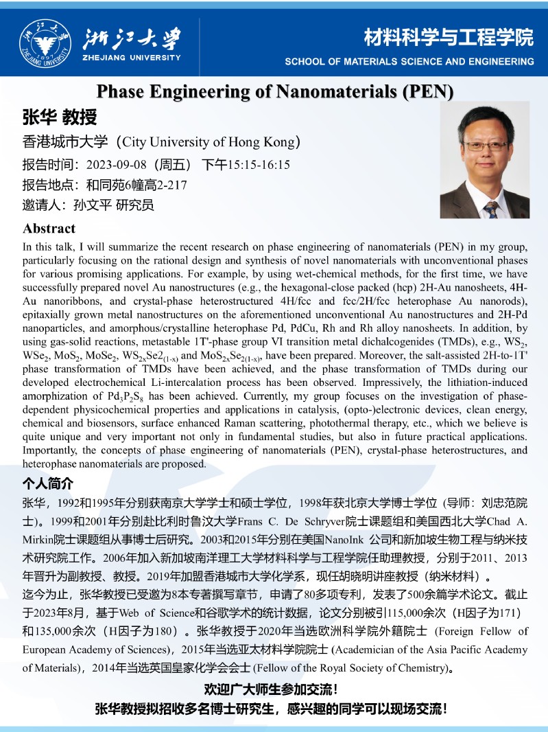 学术报告202311-关于香港城市大学张华教授学术报告的通知