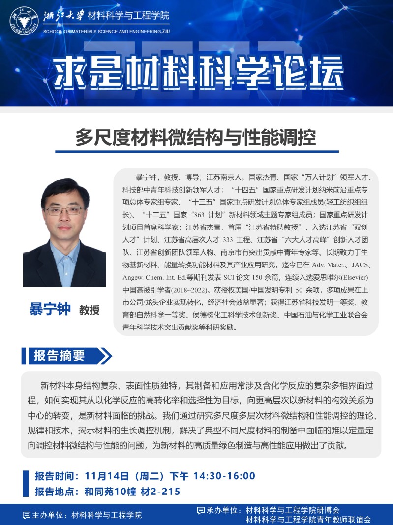 【求是材料科学论坛】2023年10期:关于暴宁钟教授报告会的通知