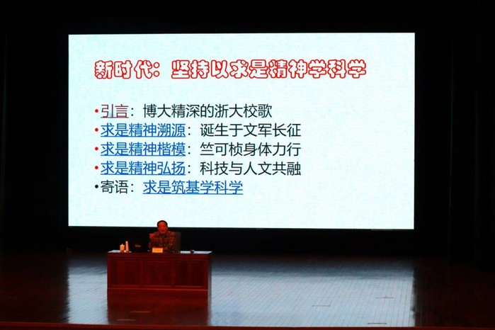 随后,哲学学院教授许为民老师作专题报告《新时代:坚持以求是精神学科学》。许老师以求是精神的楷模竺可桢先生为例,为我们阐述了求是精神的真正内涵,早在哈佛念书时,竺可桢就以研究中国科学史为己任;回国后致力教书、创办中央研究院气象研究所和主持浙江大学。他的科学史研究引领着中国,影响了世界。正是他一生的执着追求,才有今天中国科学史研究的繁荣景象;正是因为竺可桢老校长带领浙江大学西迁,浙大火种才得以保留,薪火相传。接下来,许老师从北京大学和清华大学两所高校的差异出发,探讨了科学与人文的关系,强调科学与人文应该共融才能更好的弘扬求是精神。讲座的最后,许老师对同学们寄予了殷切的希冀,他鼓励同学们在学好专业知识的同时,应当注重培养自己的科学和人文精神,打造特长和人格并存的核心竞争力,用求是精神筑就人生的基石。
