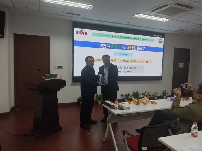 最后,朱铁军院长向张哲峰研究员颁发了求是材料科学论坛主讲嘉宾纪念碑并合影留念。在师生们的热烈掌声中,本次求是材料科学论坛圆满结束。