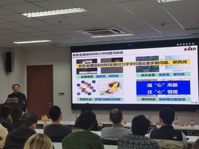 在提问环节,学生首先对张哲峰研究员表达了感谢,学生对于报告中所展示的诸多内容细节踊跃提出了自己的疑惑与思考:对于一些新型非晶合金是否符合椭圆准则,压缩断裂角度如何变化,张哲峰研究员认为在考虑压缩断裂角度时压力可能会使材料内部发生旋转,产生塑性形变使压缩断裂角度小于45°。张哲峰研究员并对其他问题一一作了详细解释,并进行了深入交流与探讨,参会人员在这次专题报告中收获颇丰。