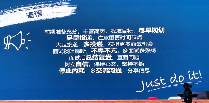 郑欣从更加细致、具体的细节入手,以自己在求职过程中遇到的各种具体情况为出发点,分享了她从中体悟的心得。在求职过程中要保持良好的心态,不被其他求职者所干扰,明确自己的目标和计划。在各个阶段,都要发挥主观能动性,充分认识自己,明确自身优势,积极获取信息,主动沟通,尽力争取。
