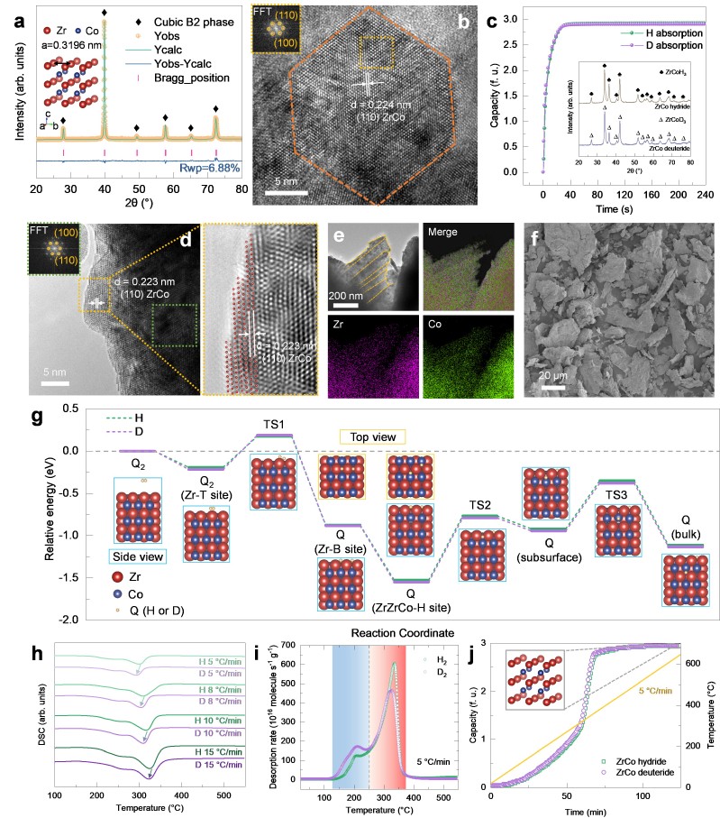 图1 ZrCo合金的微观结构和性能表征以及动力学氢同位素效应机理解析结果