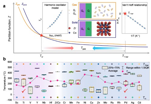对ZrCo合金的宽温域热力学氢同位素效应研究表明,其氢同位素效应会随着温度的变化而发生动态变化,并会在某一温度处出现氢同位素效应正负反转的现象(图2)。该温度被定义为临界温度Tcr,在Tcr附近释放氢同位素有望降低氢同位素比例的波动。对于氢同位素贮存材料的实际工程应用,对应1 bar平衡氢压的释放温度T1 bar被认为是氘氚燃料供给时的适宜操作温度。Tcr与T1 bar两者之间的不匹配则是导致释放过程中氢同位素比例波动的显著特征,而且Tcr和T1 bar均会随着合金成分、结构的调整而发生变动。基于此,研究团队提出一种新的氢同位素效应工程评价指标Tgap(Tgap = T1 bar - Tcr),用于定量评价工程应用条件下的氢同位素比例波动程度并指导设计氘氚稳定供给的新型ZrCo基合金(图3a)。Tgap降低则反映出气固两相间氢同位素能量差异减小,进而可缓减氘氚燃料供给时的氢同位素比例波动幅度。