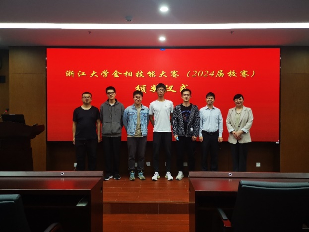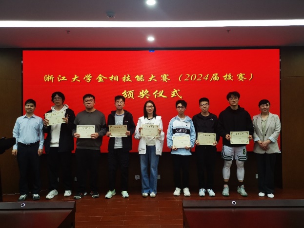 最后是大家翘首企盼颁奖环节,由刘嘉斌老师宣读获奖名单,由刘芙老师颁发获奖证书,在场的往届国手们也和指导老师们合影留念。本次比赛一共评出三等奖13人(劳航涛、李越、万伟豪等)、二等奖9人(屠有德、张智童、赵讯等)和一等奖6人(汪康旭、沈哲霄、虞东浩、裴桂斌、林竑列、陶志伟)。这六位获一等奖同学将代表浙江大学参加浙江省级金相技能大赛并由此诞生三位国赛决赛种子选手,预祝他们取得佳绩!