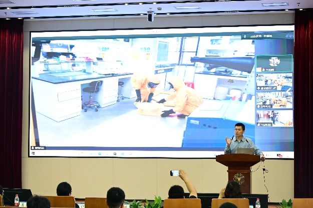 随后,演练总指挥实验室与设备管理处副处长胡凯老师宣布演练开始,浙江大学实验室安全顾问梅超先生通过远程连线的方式向大家演练并讲解了当酸液溅到皮肤上时的应急处理方案。梅超先生从伤者和处置人员的多重视角深入浅出地向我们阐述了当酸液溅到皮肤时伤者当如何应急处理自救,处置人员应当如何救治伤员、处理好现场的酸性液体。整场演练生动形象,具体细致,各位同学都受益良多。