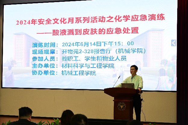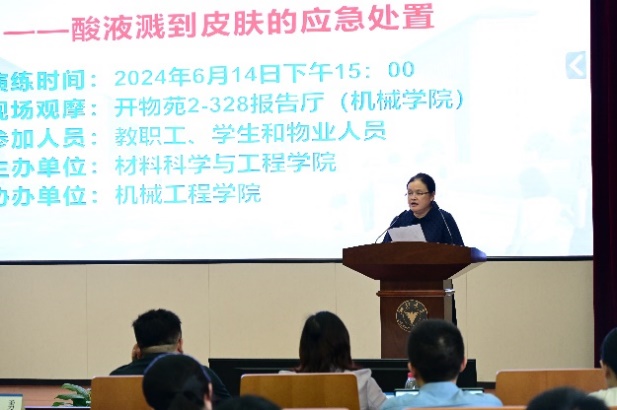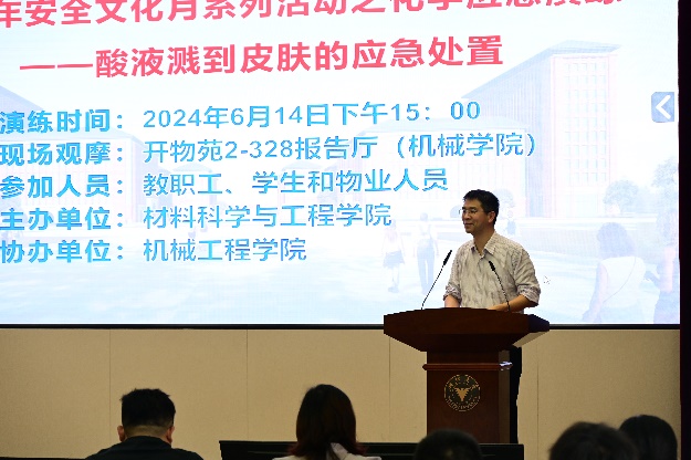 活动伊始,材料学院党委书记王晓燕老师指出,材料学院每年的化学品用量巨大,需要全面、准确的安全风险评估,提前发现和预防潜在的风险,增强应急处置和救援能力建设,培养大家自觉遵守各项安全制度和规范的意识,同时也希望同学们积极参与到本次活动中,体验“人人讲安全、个个会应急”的安全氛围。