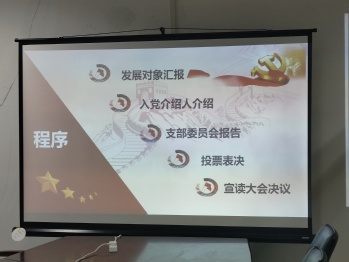 随后由入党介绍人介绍情况,两位同志在积极分子期间,一心向党组织靠拢,多次提出进一步发展的请求。思想上积极学习党的相关方针路线政策,学习上刻苦努力,积极进取,生活中团结他人,帮助同学。两位同志思想上,学习上,政治上,生活中,都十分优秀,满足了发展党员的要求。此外,两位同志满足党章中发展党员的基本流程要求,并完成相关培训。经党支部支委会议讨论决定,允许王雨辰和童慧敏同志,发展为预备党员,并提交党员大会投票表决。投票表决结果为正式党员17人均同意王雨辰和童慧敏同志发展为预备党员。最后由纪检委员胡炜媛带领王雨辰和童慧敏同志宣读入党誓词。