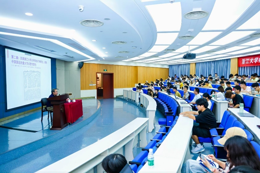 9月12日晚,浙江大学档案馆馆长王东为大家带来了一场主题为“赓续求是文脉,传承家国情怀”的精彩讲座。王馆长深情地带领大家回溯了浙江大学发展的历史长河,详细讲述了学校在各个历史阶段的重要转折和发展历程。他强调,浙江大学的办学之路始终与中国的国运紧密相连,与中华民族的命运息息相关。在每一个重大的历史节点上,浙大人都以坚定的信念和不懈的努力,为国家的发展贡献了自己的力量。王馆长希望浙大的学子们能够以史为鉴,深刻理解并传承“求是”精神,将这种精神融入到家国情怀之中,为实现中华民族的伟大复兴贡献自己的青春和智慧。