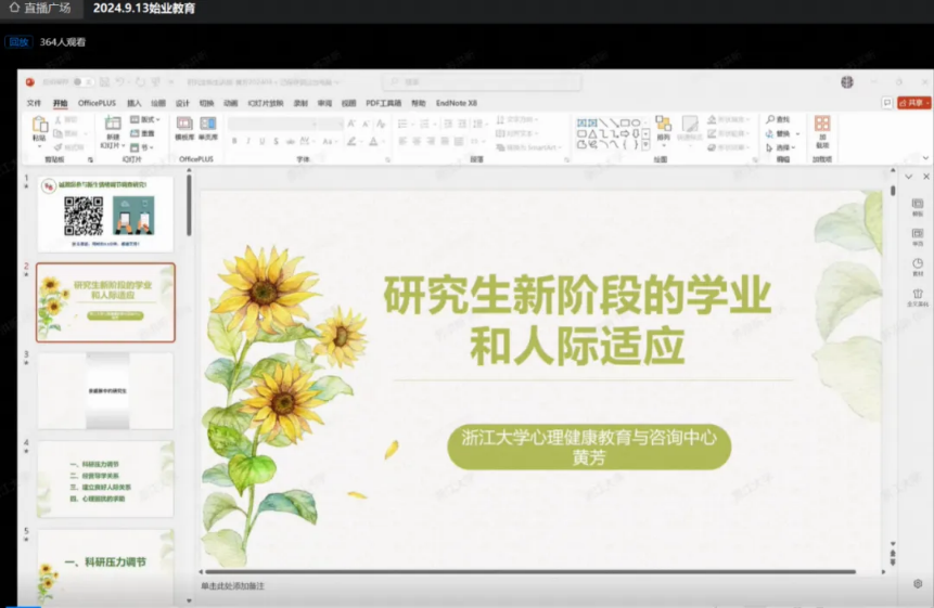 9月13日晚,浙江大学心理健康教育与咨询中心黄芳老师作了一场以“研究生心理发展与压力调适”为主题的心理健康教育专题报告会。报告中,黄老师指出“人生中最重要的事情是爱与工作”,她强调,研究生的心理成长不仅包括科研能力的提升,更涵盖了情感管理和社会互动等多方面的能力。黄芳老师详细讲解了研究生群体在面对学业和职业压力时的心理特征,以及如何通过科学的方法进行有效的压力调适。她鼓励学生们找到工作和学习的平衡点,学会在学术追求中保持身心的愉悦和健康。黄老师还分享了多种实用的压力管理技巧,包括时间管理、情绪调控和社交支持等,帮助新生们在科研和生活中找到更多的乐趣与满足。报告不仅为研究生新生们提供了强有力的心理支持,也为他们的学术和职业旅程奠定了坚实的心理健康基础。