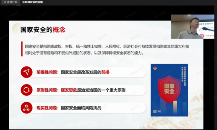 9月10日晚,化学系党委副书记丁立仲为同学们作《国家安全与形势分析》主题报告。报告中他强调,国家安全是民族发展的基石,必须牢固树立并切实贯彻总体国家安全观,时刻保持警觉。丁副书记引用古训‘安而不忘危,存而不忘亡,治而不忘乱’来提醒大家,即便在和平时期,我们也不能掉以轻心,必须居安思危,防患未然。这样的警示不仅是对当前国际形势的深刻洞察,也是对国家安全观教育的一次生动阐释。