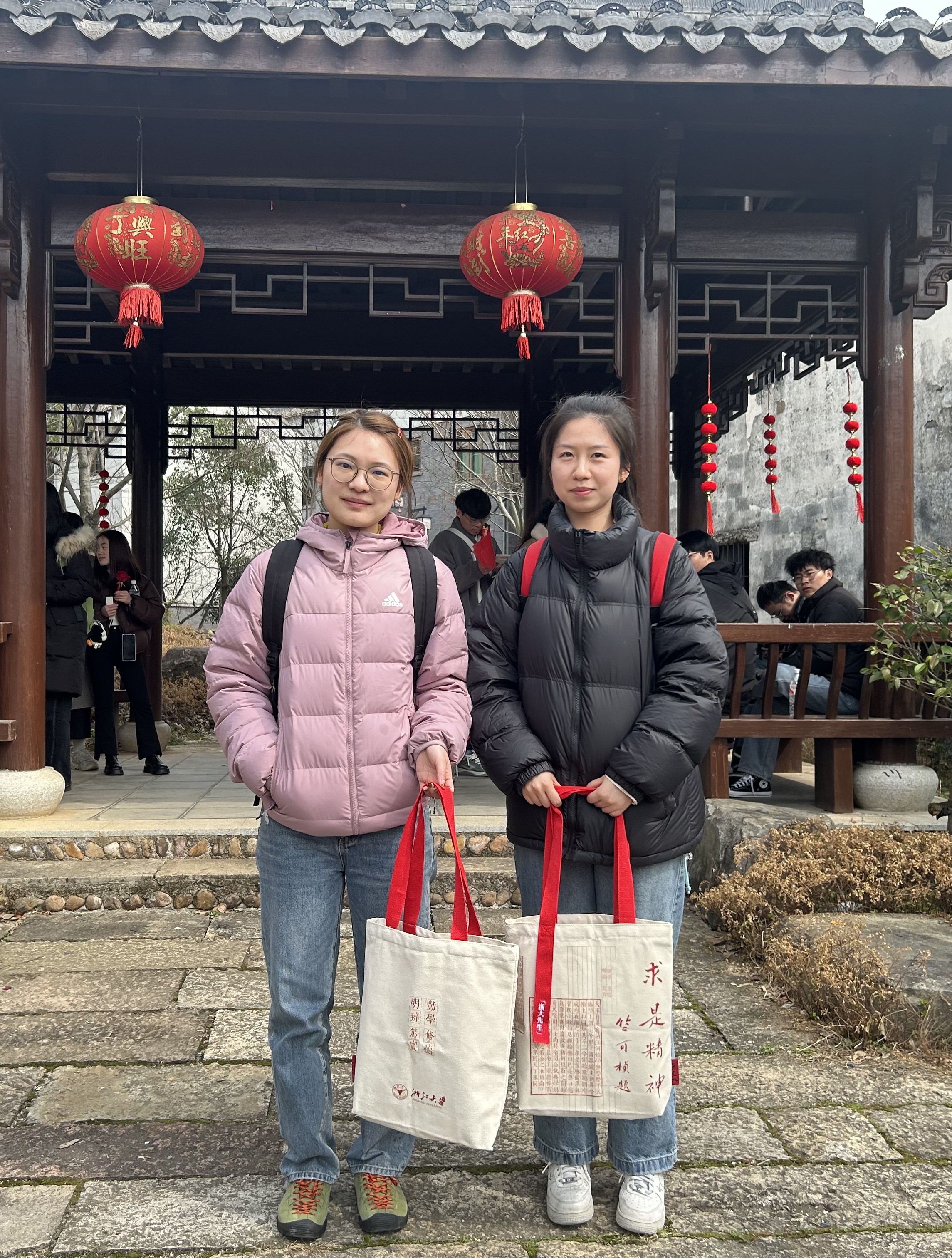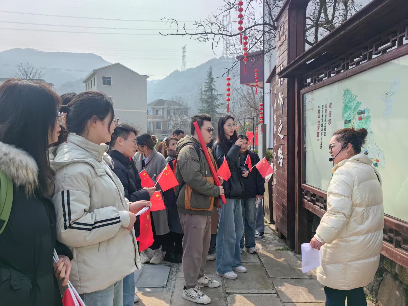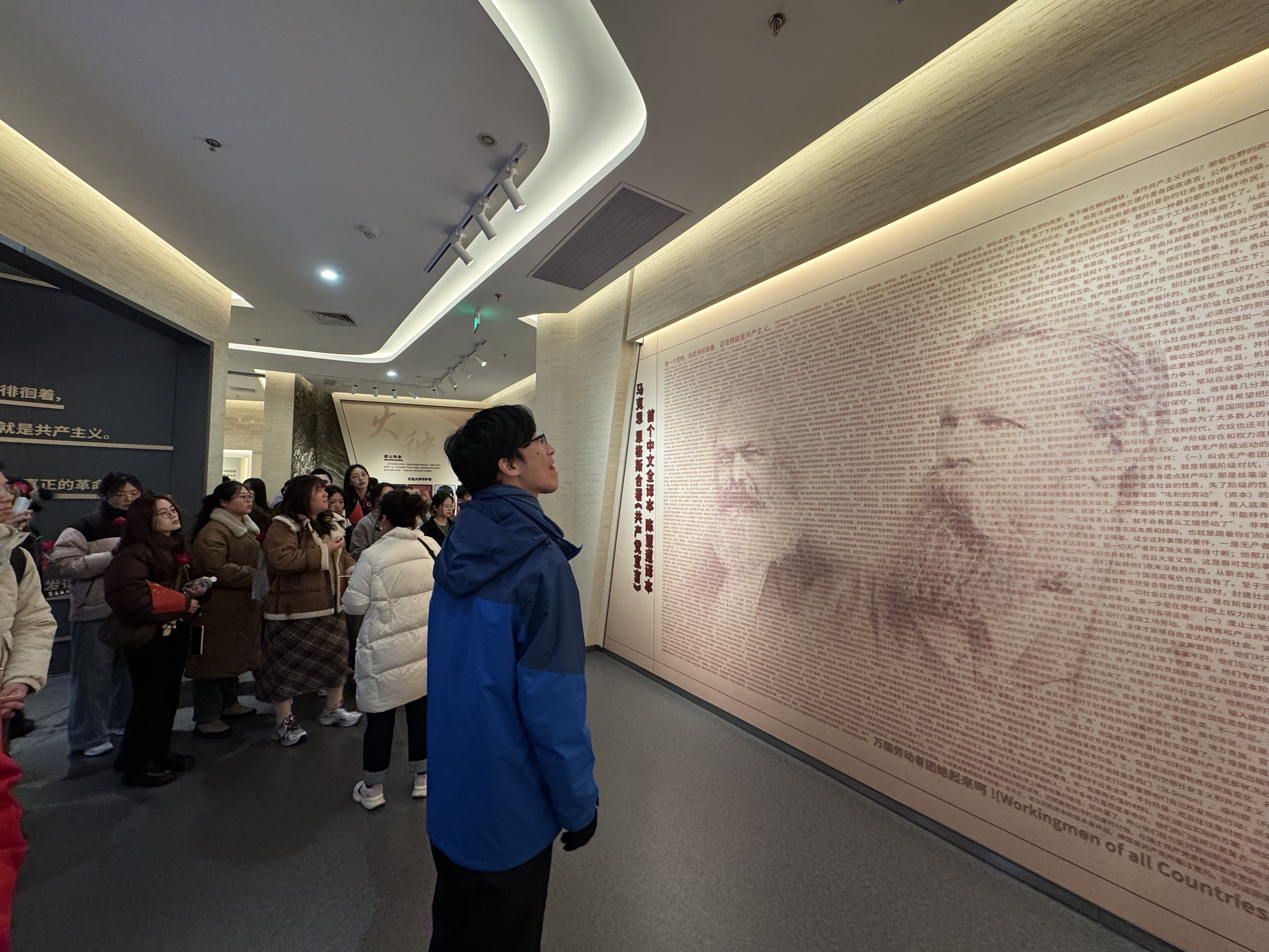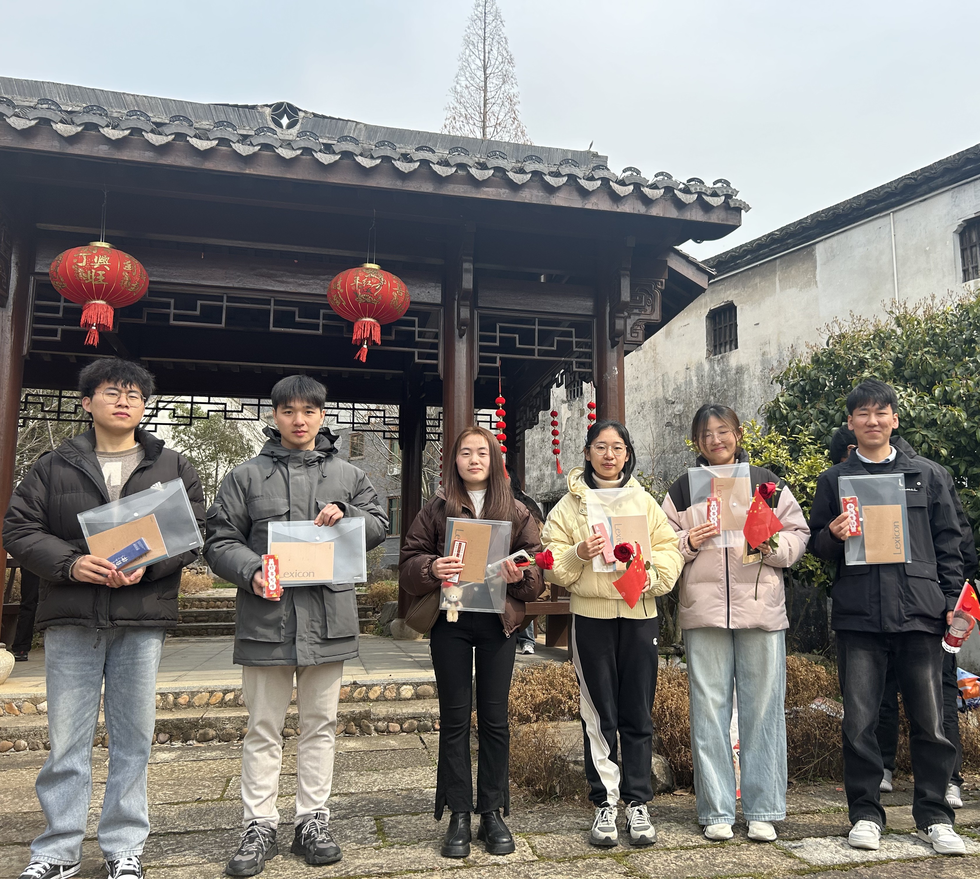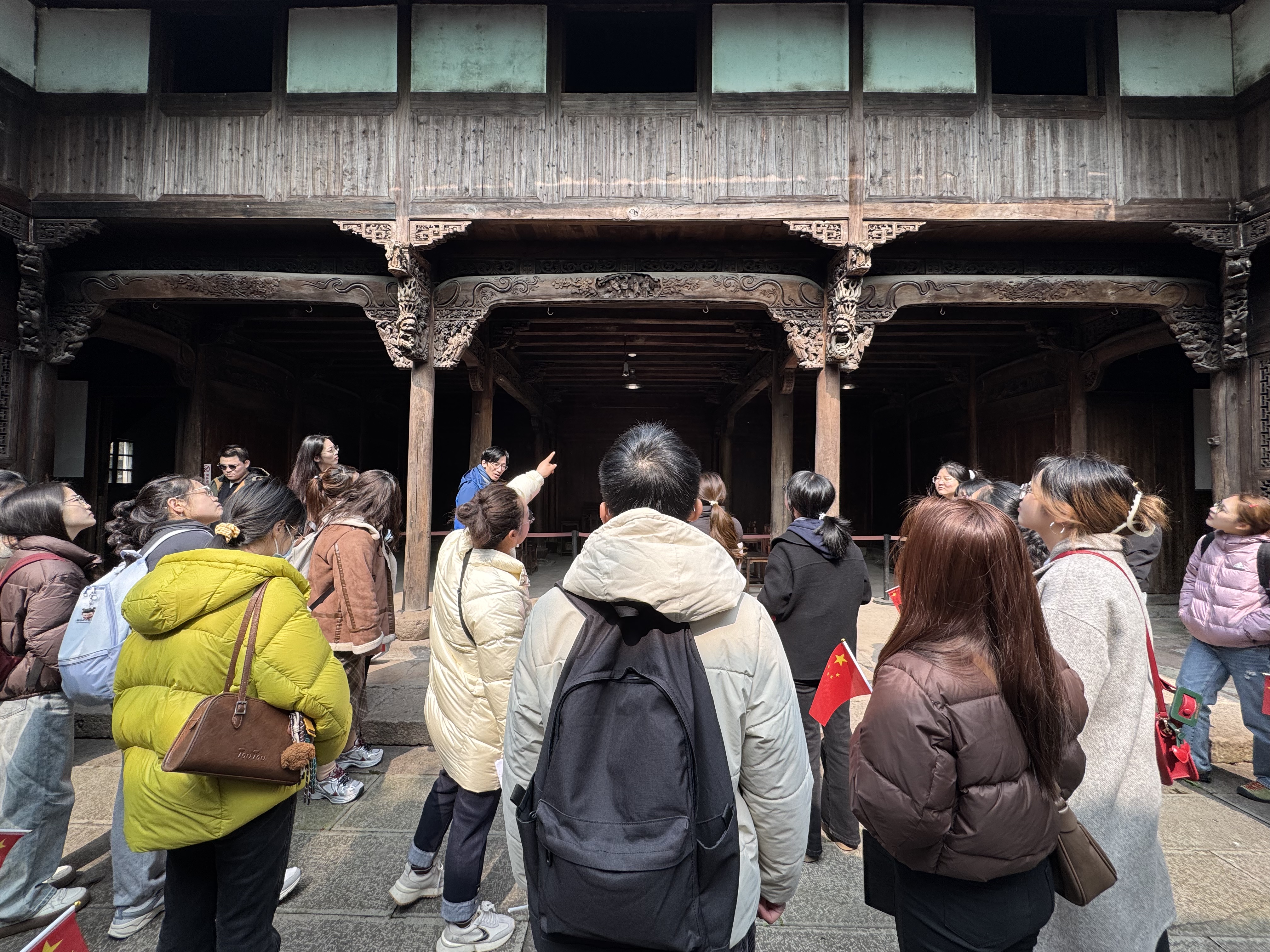 随后,大家进入陈望道故居,也就是陈望道先生度过青少年的地方。门窗上的东阳木雕,是望道先生父亲专意挑选的,呈现着关羽张飞等古代英雄好汉的故事,他的父亲还变卖田产,力排众议,让子女走出山村求知问学,最终培养出栋梁之材。好的教育环境会影响人的一生,我们有幸生长在重视教育科技人才的时代,更应不负使命,挺膺担当。从陈家老屋走出,刚到门口,女生们就被递上一支玫瑰花,原来恰逢三八妇女节,当地政府准备了这个小惊喜。信仰之路,更添了温情。