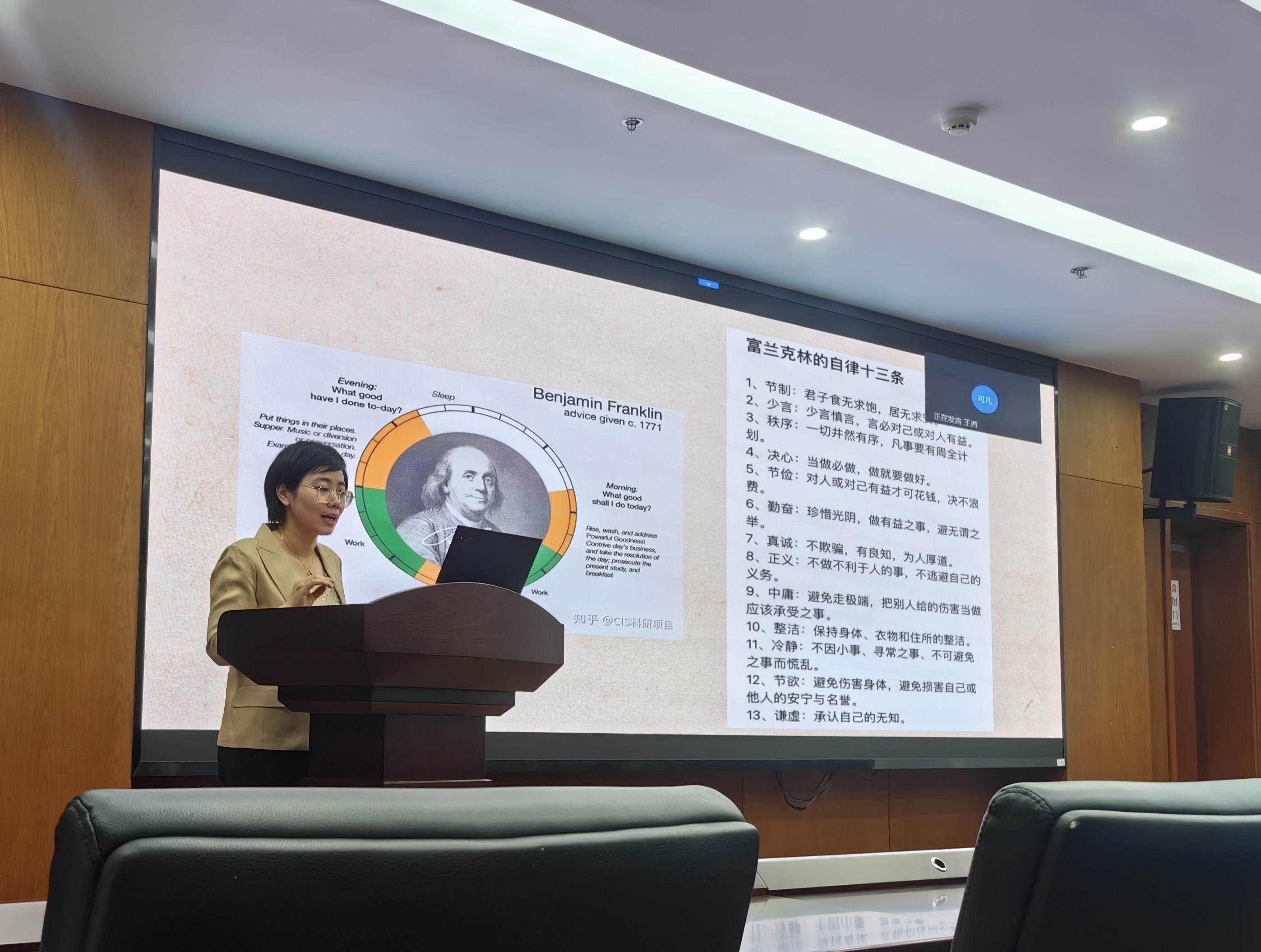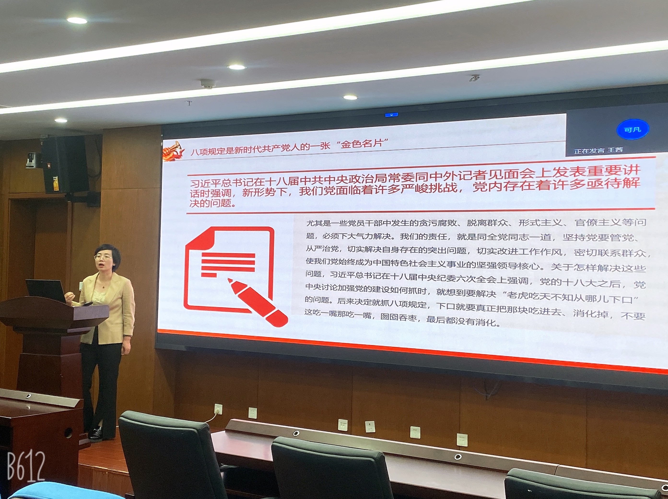 会议伊始,王育萍老师以“纪律建设与青年成长”为主题,通过历史回溯—现实阐释—实践指引的逻辑脉络,为大家带来了一堂精彩纷呈的微党课。王老师从秋收起义后毛泽东提出的“三项纪律”讲起,梳理了“三大纪律八项注意”的形成历程,指出钢铁的纪律是党取得革命胜利的关键法宝,并强调了“可操作性规定”对基层实践的指导价值。结合自身多年见闻,老师用丰富的案例解读了“严标准、真执行”的时代要求,警示党员同志们“执行纪律不能有任何含糊”,强调要把政策文件精神转化为实实在在的具体行动。随后,老师继续延伸,讲到富兰克林的“自律十三条”、周总理的“我的修养要则”,以伟人做榜样,讲述他们如何把对自我的高要求转化成务实的行动、进而提升自我修养,引导大家强化自我约束。