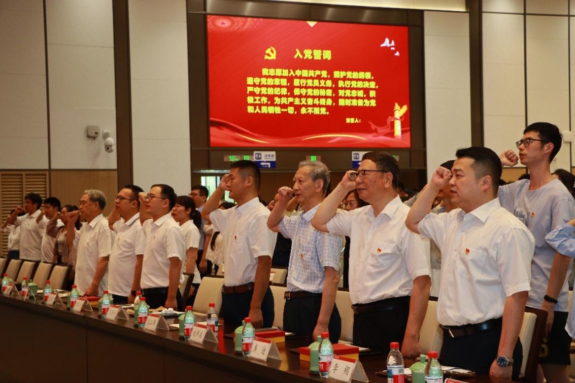 在学院党委书记王晓燕老师的带领下,新发展党员上台进行庄严的入党宣誓。台上的新发展党员和台下的党员共同举起右拳,重温入党誓词,不忘初心,牢记使命,坚定自身的信念,永葆一颗赤子之心。
