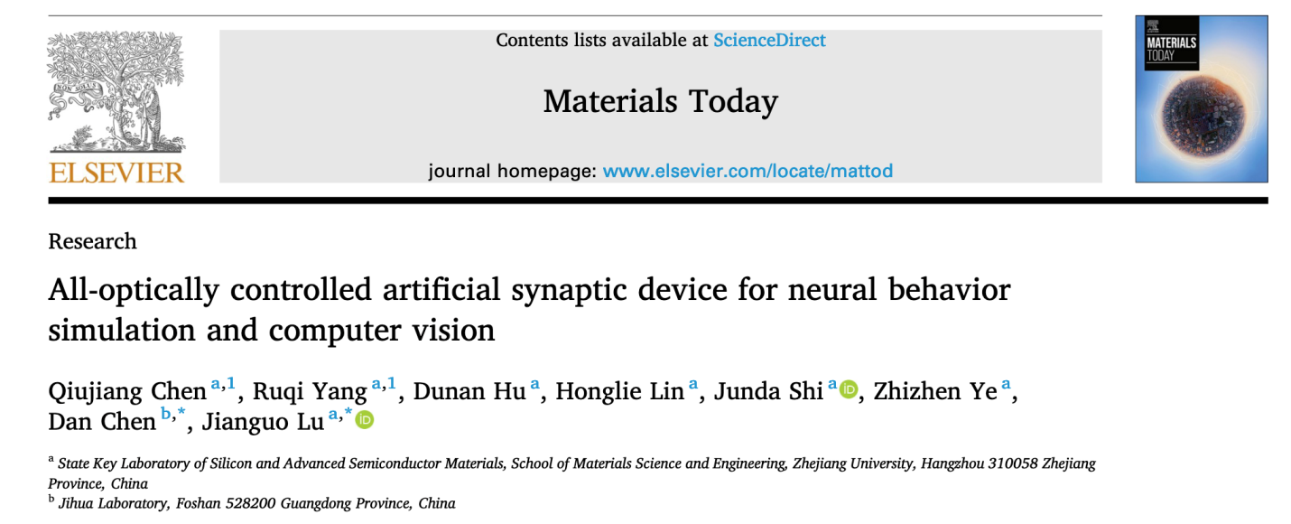 浙江大学材料学院本科生陈秋江Materials Today:全光控人工突触器件,模拟大脑行为并赋能计算机视觉新应用
