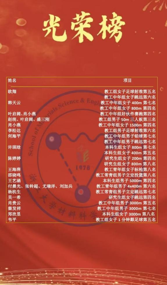 两天的赛程虽已落幕,但那些奋力冲刺的瞬间、温暖相守的画面、为集体荣誉而战的决心,已深深烙印在每一位材料人的心中。这段共同拼搏的时光,必将化作前行的动力,激励我们在未来的征程中继续保持奋斗的姿态,勇立潮头,乘风破浪,谱写属于材料学院的崭新篇章!