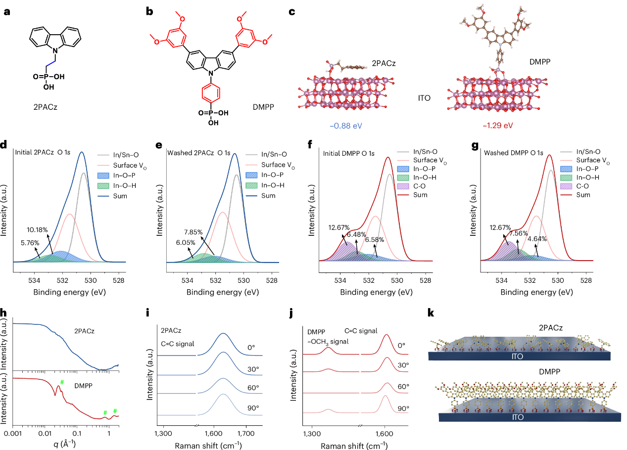 研究人员通过在SAM材料中引入刚性共轭桥联单元以提升导电性与偶极矩,从理论和实验上证明了DMPP分子的强锚定能力以及堆积有序性。