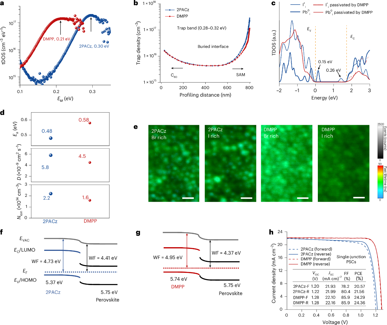 研究团队通过电学测试和理论计算证明了基于DMPP分子制备的钙钛矿薄膜缺陷显著减少,并且抑制了离子迁移,优化了能级排列,最终1.68eV宽带隙钙钛矿太阳电池实现了24.36%的效率。