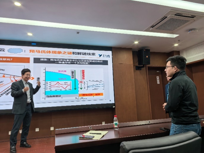报告结束后的互动环节,朱铁军院长团队成员以及材料学院现场其他师生踊跃提问,围绕基于经典铁性物理大厦Landau理论任晓兵教授团队开发的新理论,正逆压电效应等问题进行了深入交流,朱铁军院长也根据这些问题向研究生们提出了很多建议,现场学术氛围浓厚,听众纷纷表示受益匪浅。